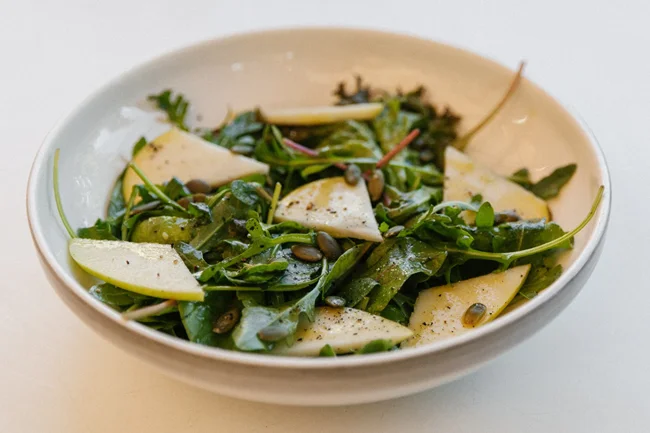ростбиф из говяжей вырезки, микс салата, картофель беби, соус айоли, вяленые томаты, крем бальзамик