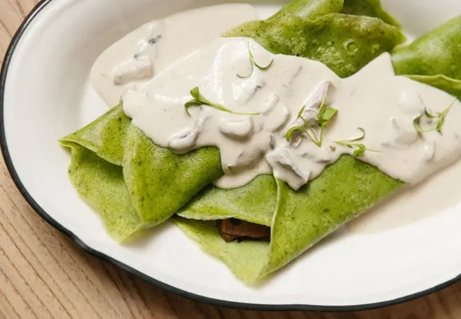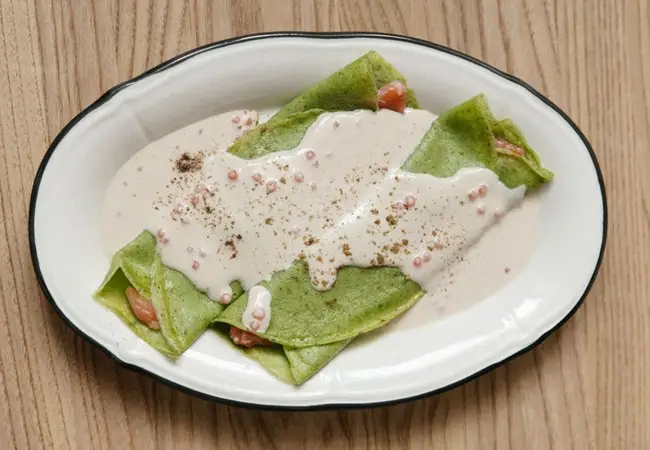 Блины с лососем, икрой и соусом из запеченного чеснока
